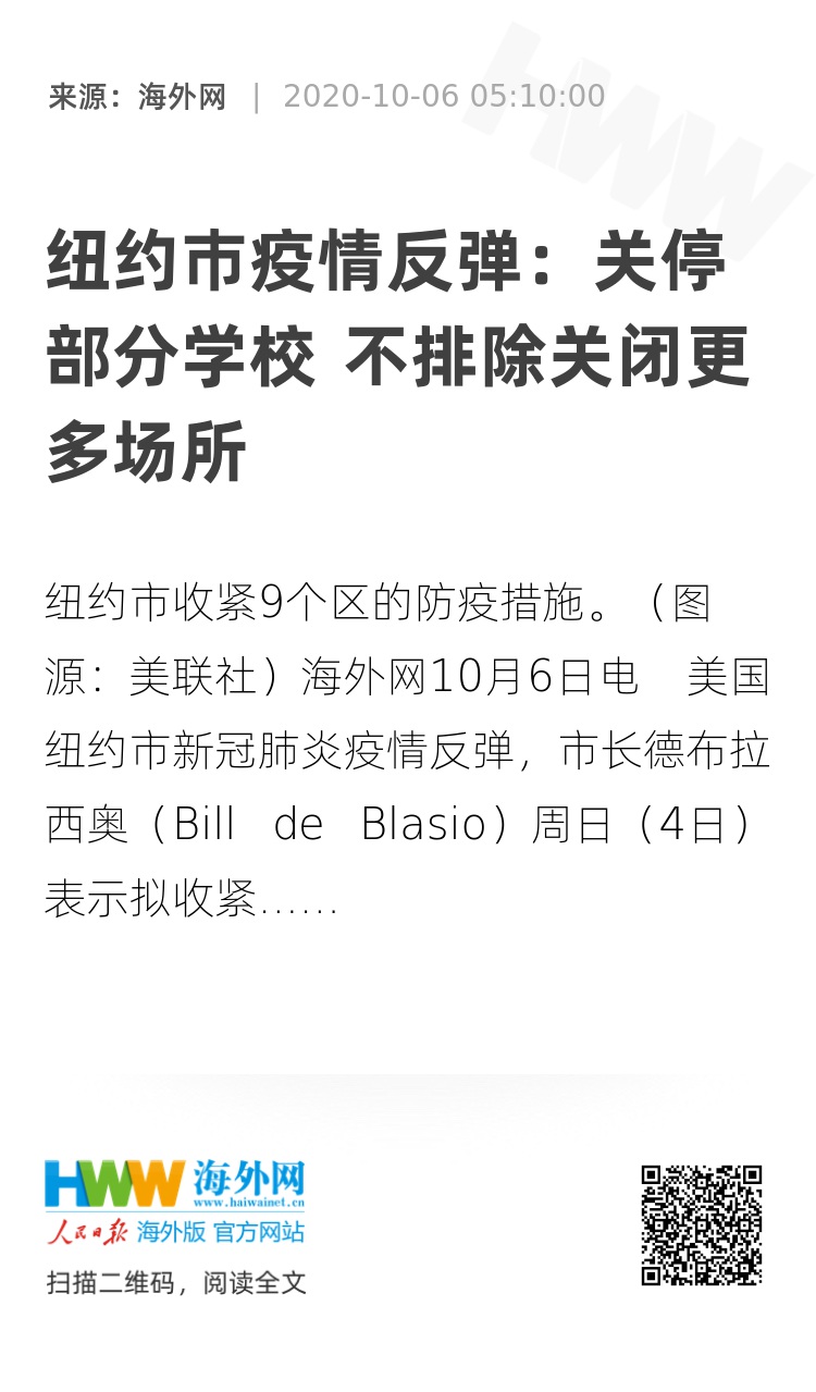 海外网10月6日电 美国纽约市新冠肺炎疫情反弹,市长德布拉西奥(Bill de Blasio)周日(4日)表示拟收紧9个区的防疫措施,将寻求纽约州长科莫(Andrew Cuomo)批准。科莫周一(5日)下令,纽约巿相关地区的学校周二(6日)起停课,非必要商业活动亦须暂停。