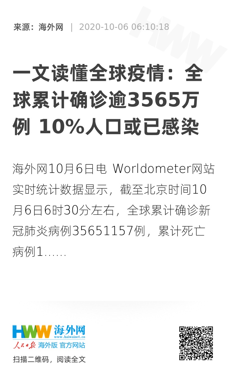 海外网10月6日电 Worldometer网站实时统计数据显示,截至北京时间10月6日6时30分左右,全球累计确诊新冠肺炎病例35651157例,累计死亡病例1045055例,103个国家确诊病例超过万例。