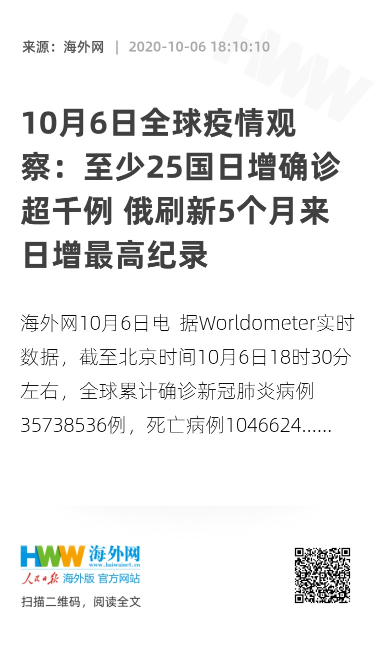 海外网10月6日电 据Worldometer实时数据,截至北京时间10月6日18时30分左右,全球累计确诊新冠肺炎病例35738536例,死亡病例1046624例。包括美国、巴西、印度、俄罗斯等国在内的至少25个国家单日新增确诊病例数均超过千例,其中印度新增61267例,美国新增35398例,巴西新增11946例。