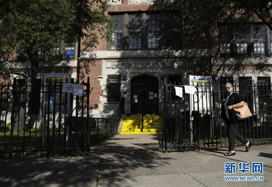 10月6日,在美国纽约,一名行人从一所公立学校外走过。 纽约市部分地区的学校6日开始关闭,以防止新冠疫情继续扩散。 新华社记者 王迎 摄