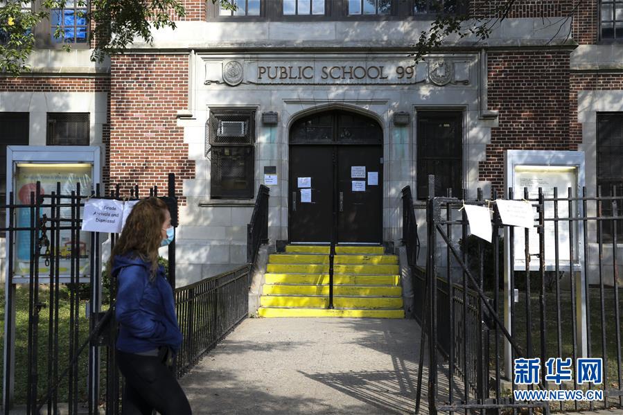 10月6日,在美国纽约,一名行人从一所公立学校外走过。 纽约市部分地区的学校6日开始关闭,以防止新冠疫情继续扩散。 新华社记者 王迎 摄