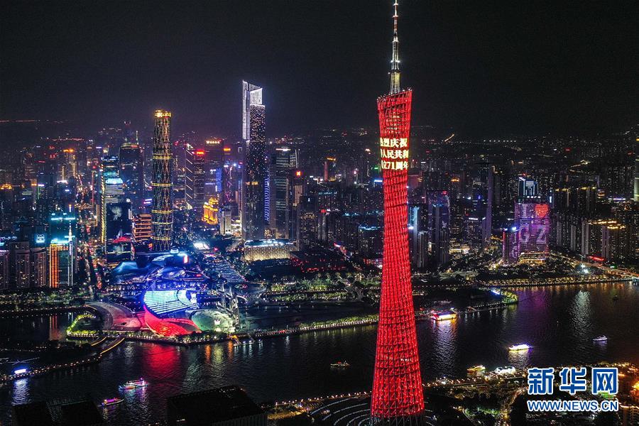这是点亮节庆彩灯的广州塔(10月3日摄)。 新华社记者 刘大伟 摄