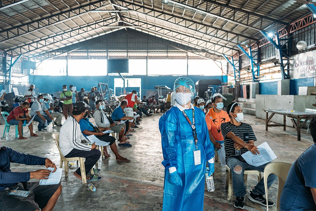 当地时间2020年10月6日,菲律宾首都马尼拉,卫生工作者为人们采样进行新冠病毒检测。马尼拉公共信息办公室此前称,市场小贩、商场雇员、超市酒店及餐厅员工,还有三轮车及巴士司机等人群可以得到免费的核酸检测。图片来源:视觉中国