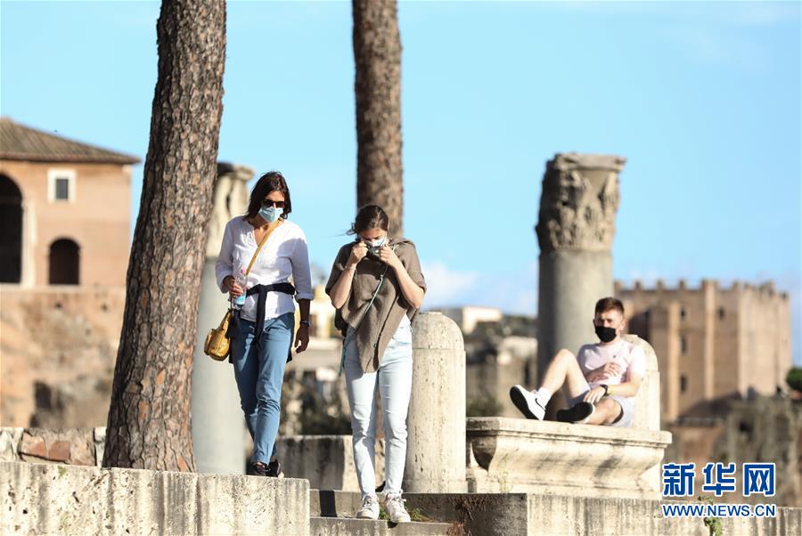 10月6日,在意大利首都罗马,人们戴着口罩散步。 意大利政府7日宣布将新冠疫情下的国家紧急状态延长至2021年1月31日,并再次宣布加强全国范围内的疫情防控措施,民众在全国范围内的公共场所(含户外)均须佩戴口罩。 新华社记者 程婷婷 摄