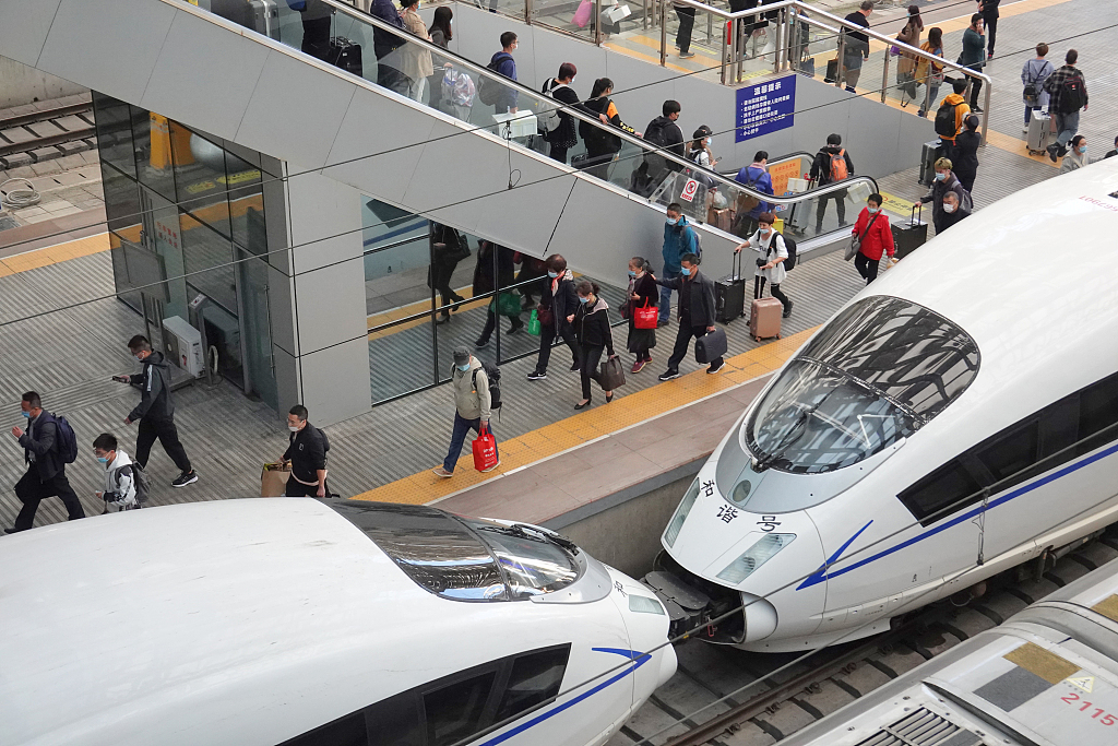 2020年10月8日,旅客在山东烟台火车站乘车。图片来源:视觉中国