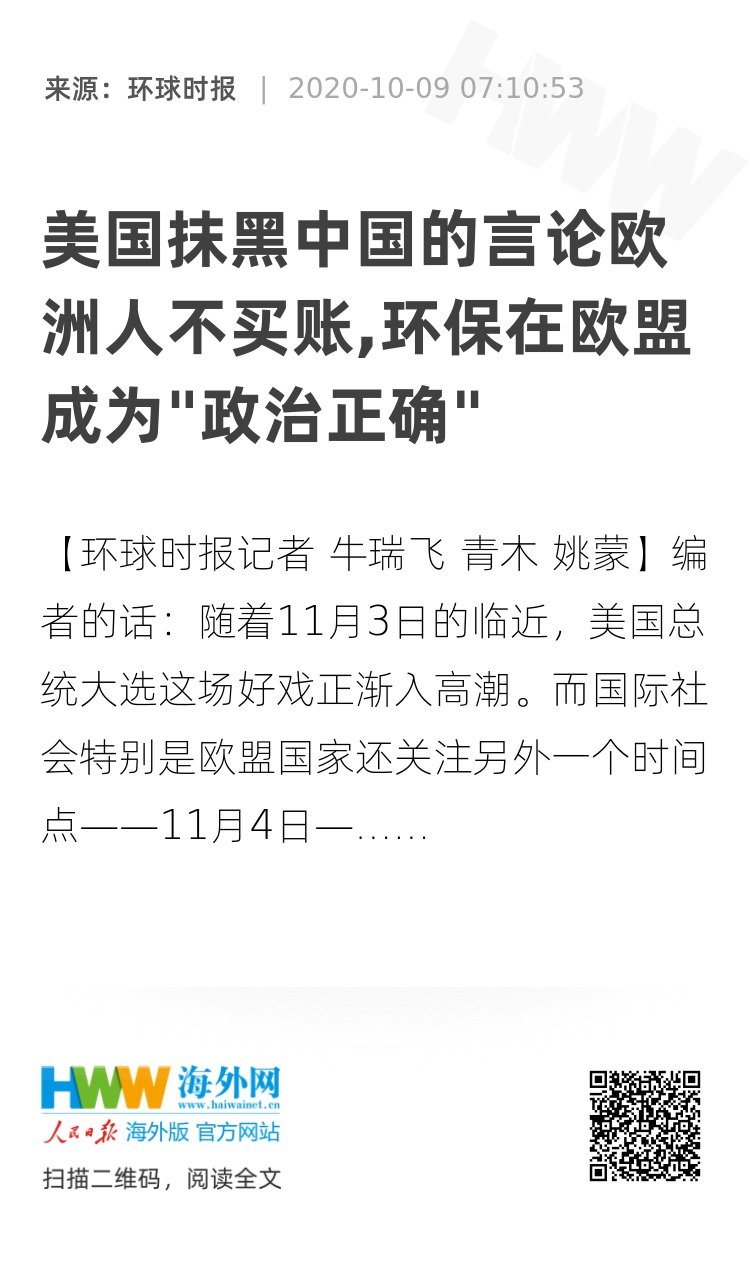 【环球时报记者 牛瑞飞 青木 姚蒙】编者的话:随着11月3日的临近,美国总统大选这场好戏正渐入高潮。而国际社会特别是欧盟国家还关注另外一个时间点——11月4日——特朗普政府原定在这一天完成退出《巴黎协定》的程序。美国领导人自己宣布退出应对全球气候变化的国际协定,却在9月下旬的联合国大会一般性辩论中就环保问题抹黑中国,并影射欧盟国家说,“那些攻击美国环保成效而忽视中国严重污染的人对环境并不感兴趣。”随后,美国务院又炮制并公布所谓“中国破坏环境事实清单”。美国对中国环保贡献的抹黑言行,不仅被中方批为“出于政治目的上演的又一出反华闹剧”,也没有得到欧盟国家的随声应和。《环球时报》驻欧盟多国记者的调查显示,从欧盟整体到各个成员国,从政府到民间,重视环保问题越来越成为一种“政治正确”。