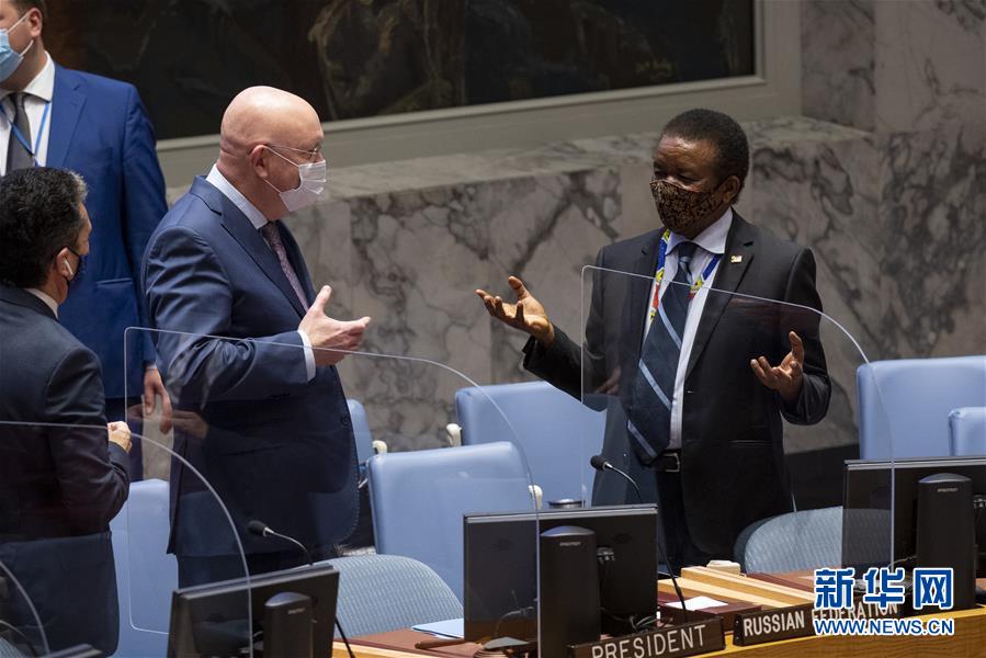 10月8日,在位于纽约的联合国总部,联合国安理会10月轮值主席、俄罗斯常驻联合国代表瓦西里·涅边贾(右二)与南非常驻联合国代表马蒂拉(右一)在安理会马里局势公开会前交谈。 联合国安理会8日在安理会厅举行马里局势公开会。这是安理会厅因新冠疫情关闭近7个月后首次重新启用。 新华社发(联合国供图)