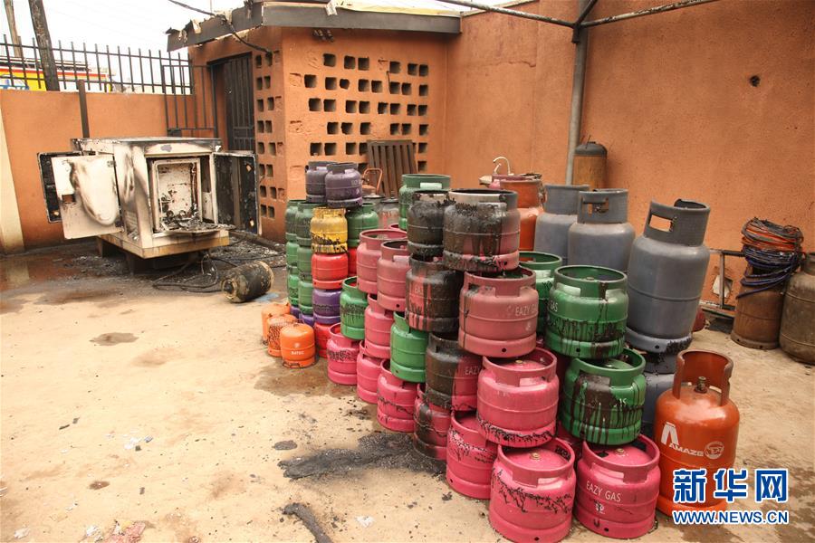 这是10月8日在尼日利亚拉各斯拍摄的多个从燃气站爆炸事故现场转移出的燃气罐。 尼日利亚官员8日说,该国南部拉各斯市郊一个燃气站当天早晨发生爆炸,已造成至少8人死亡,另有多人受伤。 新华社发(埃马纽埃尔·奥索蒂摄)