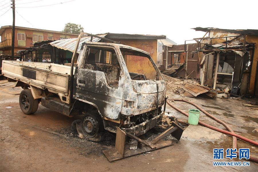 这是10月8日在尼日利亚拉各斯拍摄的一辆在燃气站爆炸事故中受损的车辆。 尼日利亚官员8日说,该国南部拉各斯市郊一个燃气站当天早晨发生爆炸,已造成至少8人死亡,另有多人受伤。 新华社发(埃马纽埃尔·奥索蒂摄)