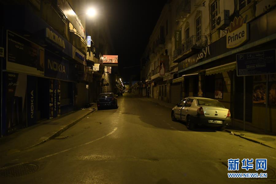 这是10月8日晚拍摄的突尼斯首都突尼斯市中心空旷的街道。 为防止新冠疫情扩散,突尼斯政府决定自8日起在大突尼斯地区实施为期15天的宵禁。 新华社发(阿代尔摄)