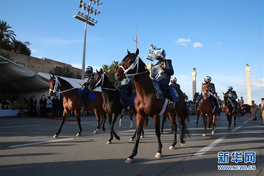 10月8日,利比亚警察在的黎波里行进接受检阅。 当日,利比亚在首都举行活动庆祝警察日。 新华社发(哈姆扎·图尔基亚摄)