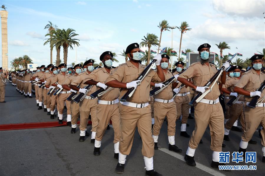 10月8日,利比亚警察在的黎波里行进接受检阅。 当日,利比亚在首都举行活动庆祝警察日。 新华社发(哈姆扎·图尔基亚摄)