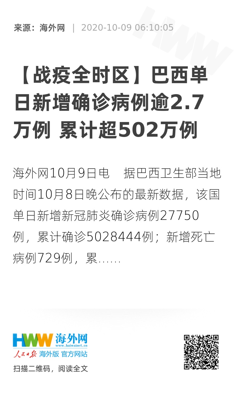 海外网10月9日电 据巴西卫生部当地时间10月8日晚公布的最新数据,该国单日新增新冠肺炎确诊病例27750例,累计确诊5028444例;新增死亡病例729例,累计死亡病例148957例。