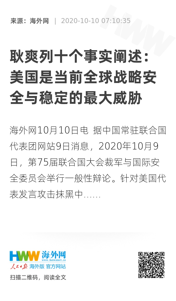 海外网10月10日电 据中国常驻联合国代表团网站9日消息,2020年10月9日,第75届联合国大会裁军与国际安全委员会举行一般性辩论。针对美国代表发言攻击抹黑中国,中国常驻联合国副代表耿爽大使行使答辩权,对美方进行有力驳斥和坚决回击。耿爽大使发言全文如下:
