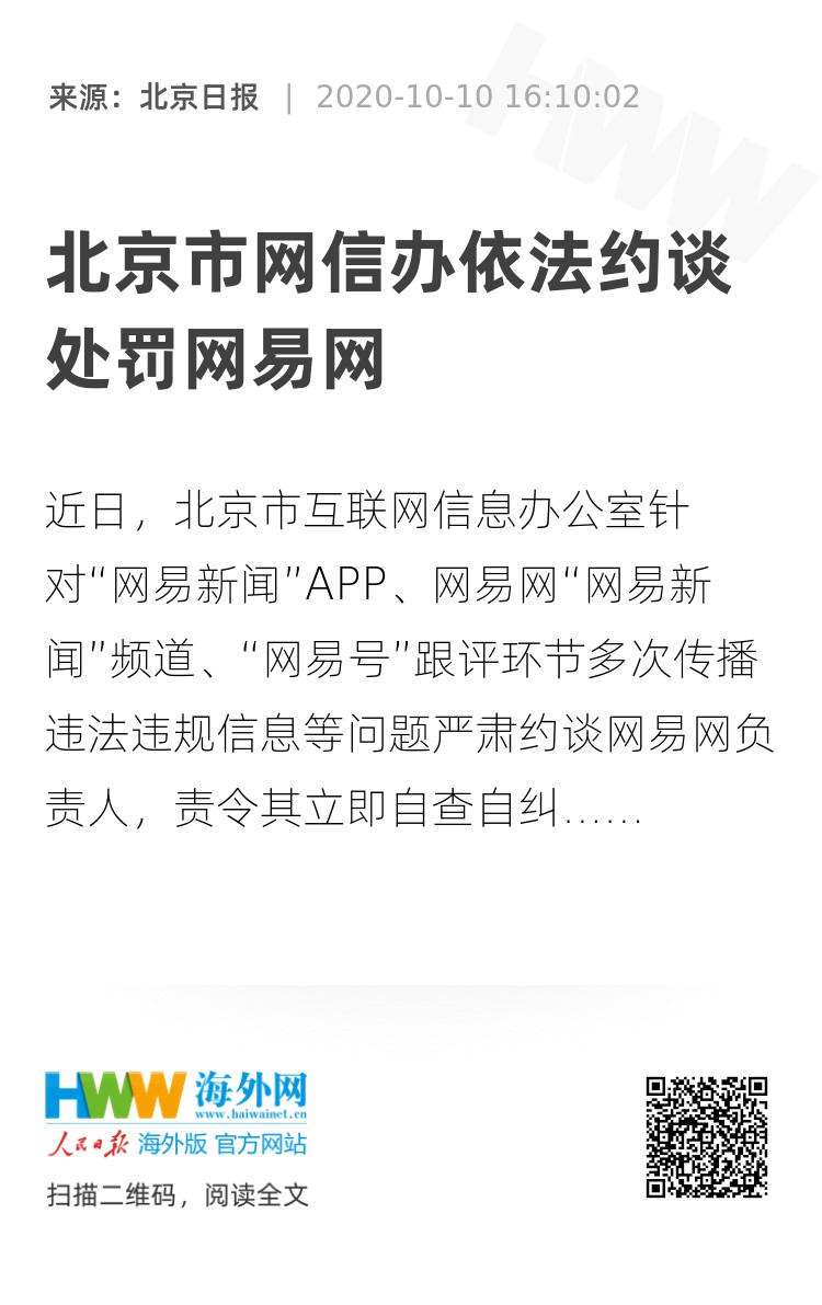 近日,北京市互联网信息办公室针对“网易新闻”APP、网易网“网易新闻”频道、“网易号”跟评环节多次传播违法违规信息等问题严肃约谈网易网负责人,责令其立即自查自纠、全面深入整改,严肃处理相关责任人。同时,北京市互联网信息办公室依法对网易网实施罚款等行政处罚。网易网负责人表示,将严格落实相关法律法规要求,深刻吸取教训,全面加强平台业务和人员管理,在整改期间自行暂停“网易新闻”APP跟评功能一周,时间自10月10日12时至10月17日12时。