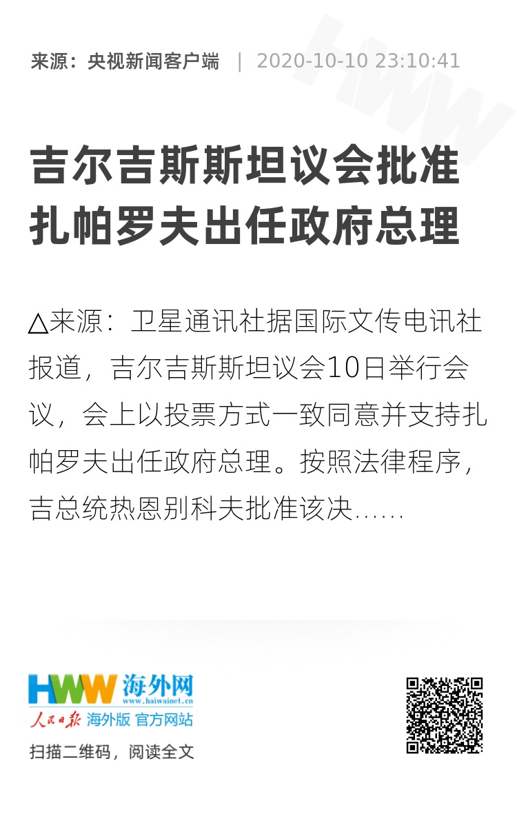据国际文传电讯社报道,吉尔吉斯斯坦议会10日举行会议,会上以投票方式一致同意并支持扎帕罗夫出任政府总理。按照法律程序,吉总统热恩别科夫批准该决议后,扎帕罗夫将正式上任。