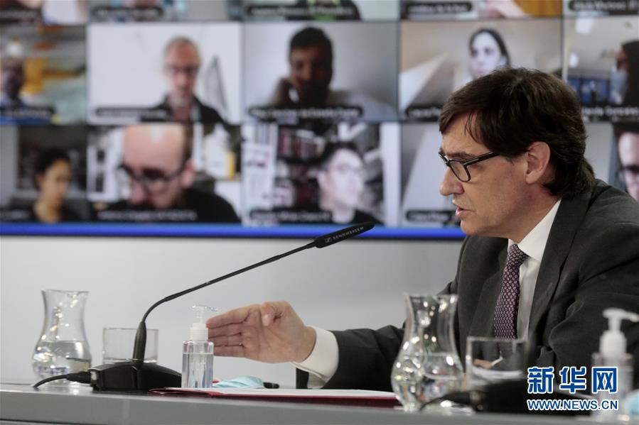10月9日,西班牙卫生大臣伊利亚在马德里首相府举行的新闻发布会上发言。 西班牙政府9日发布公报,宣布首都马德里及马德里自治区即日起进入为期15天的紧急状态,以遏制新冠病毒的传播。西班牙当天举行内阁特别会议,卫生大臣伊利亚和内政大臣马拉斯卡会后在首相府举行联合新闻发布会。伊利亚说,实施紧急状态是为了让中央政府合法落实限制人员流动的措施,政府的职责是减缓新冠病毒的传播,“即使这意味着需要有所牺牲”。 新华社发(西班牙首相府供图)
