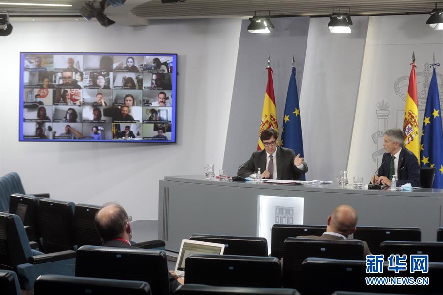 10月9日,西班牙卫生大臣伊利亚(左)和内政大臣马拉斯卡在马德里首相府举行新闻发布会。 西班牙政府9日发布公报,宣布首都马德里及马德里自治区即日起进入为期15天的紧急状态,以遏制新冠病毒的传播。西班牙当天举行内阁特别会议,卫生大臣伊利亚和内政大臣马拉斯卡会后在首相府举行联合新闻发布会。伊利亚说,实施紧急状态是为了让中央政府合法落实限制人员流动的措施,政府的职责是减缓新冠病毒的传播,“即使这意味着需要有所牺牲”。 新华社发(西班牙首相府供图)