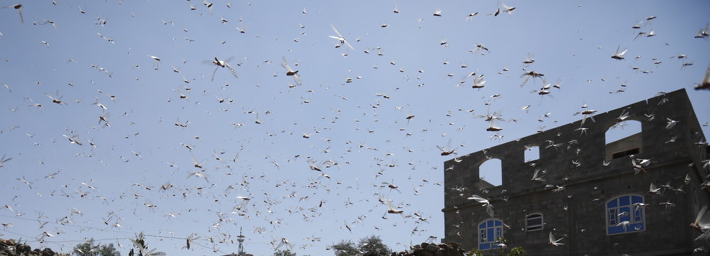 当地时间2020年10月9日,也门萨那,沙漠蝗虫满天飞触目惊心。沙漠蝗虫在也门几个城市蔓延,对该国的粮食安全造成威胁。图片来源:东方IC