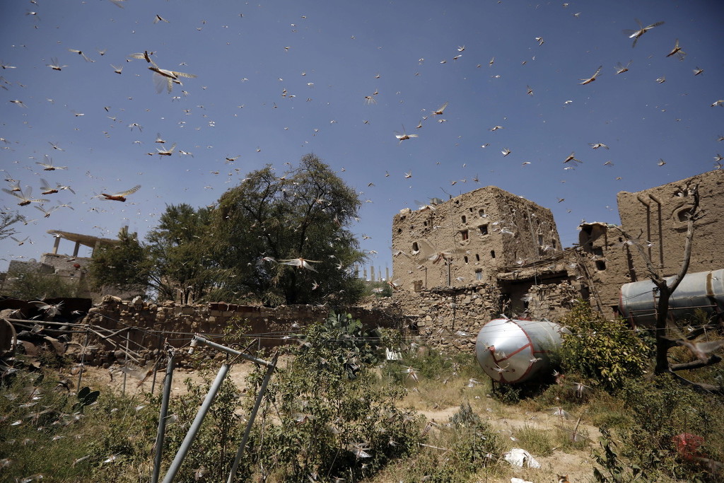 当地时间2020年10月9日,也门萨那,沙漠蝗虫满天飞触目惊心。沙漠蝗虫在也门几个城市蔓延,对该国的粮食安全造成威胁。图片来源:东方IC