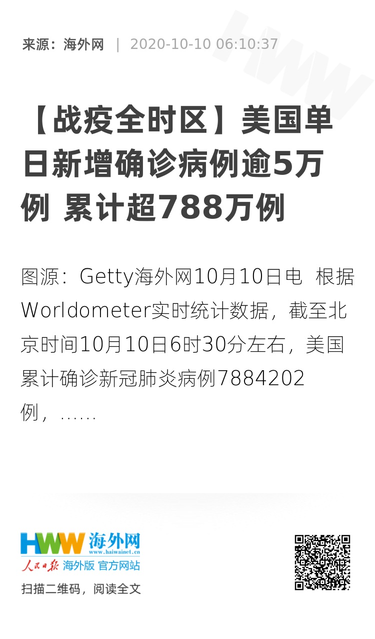 海外网10月10日电 根据Worldometer实时统计数据,截至北京时间10月10日6时30分左右,美国累计确诊新冠肺炎病例7884202例,累计死亡218464例。与前一日6时30分数据相比,美国新增确诊病例50439例,新增死亡病例726例。