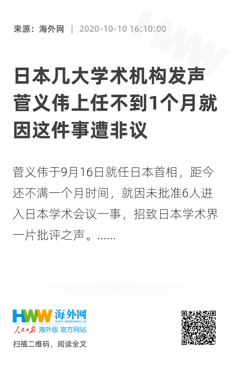海外网10月10日电 菅义伟于9月16日就任日本首相,距今还不满一个月时间,就因未批准6人进入日本学术会议一事,招致日本学术界一片批评之声。日前,多个知名学术机构集体发声,除了要求政府详细说明拒绝批准的理由,还接连在海外刊物发表评论,要求政府就争议问题尊重学术独立性,“雪球”呈越滚越大之势。