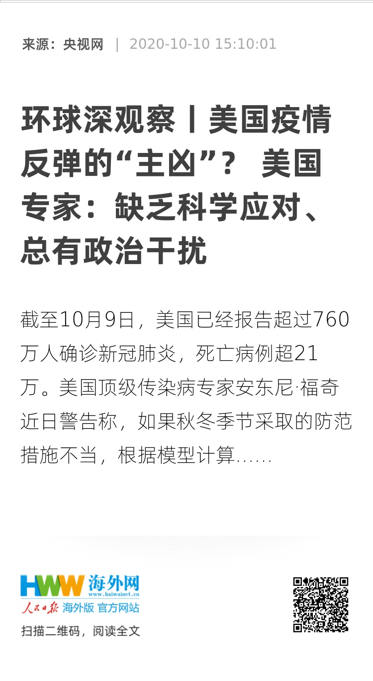 苏晓晖:“美国的政界、美国的高层在疫情防控的方面,一方面缺乏政策,另外一方面有一种更加危险的动向。似乎在大选的背景之下,美国政客所考虑的仍然是如何来压制疫情在美国国内、在这种政治层面产生的影响,以掩耳盗铃的方式来试图为选情加分,而不是把更多的精力投入到抗疫的活动中来,是让民众有了更多的误导信息,是让民众对新冠肺炎疫情减少重视的程度,甚至可能因此造成更多的感染病例。”