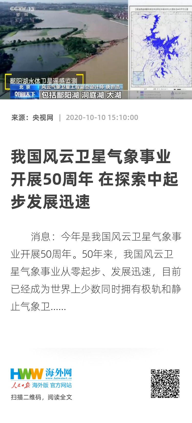 央视网消息:今年是我国风云卫星气象事业开展50周年。50年来,我国风云卫星气象事业从零起步、发展迅速,目前已经成为世界上少数同时拥有极轨和静止气象卫星的国家或地区之一。
