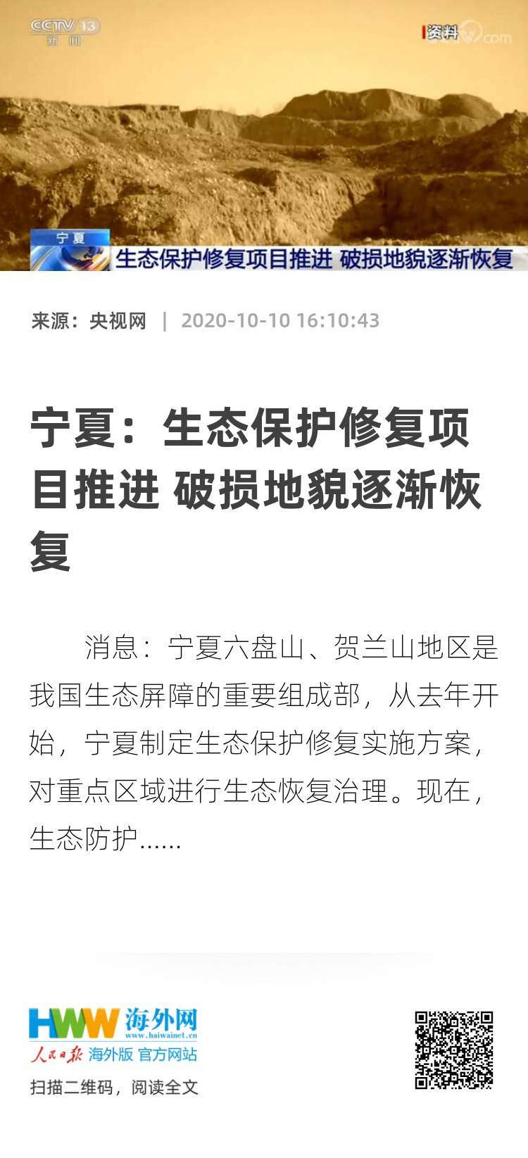央视网消息:宁夏六盘山、贺兰山地区是我国生态屏障的重要组成部,从去年开始,宁夏制定生态保护修复实施方案,对重点区域进行生态恢复治理。现在,生态防护林、经济林、湿地等“五个百万亩”生态修复治理项目正在规划建设,破损地区自然风貌已经逐渐恢复。