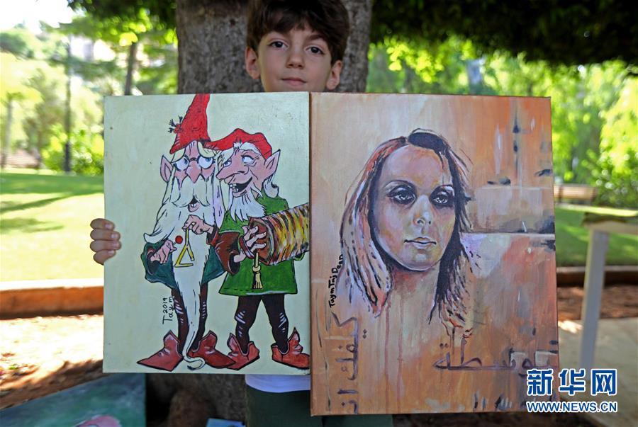 10月10日,在黎巴嫩首都贝鲁特市中心一座公园内,一名男孩展示其创作的艺术作品。 黎巴嫩百余名艺术家10日在首都贝鲁特市中心一座公园举办绘画和雕塑艺术创作展,其收益用于帮助那些在贝鲁特港大爆炸中受灾的家庭。这一艺术展将持续两天。 新华社发(比拉尔·贾维希摄)