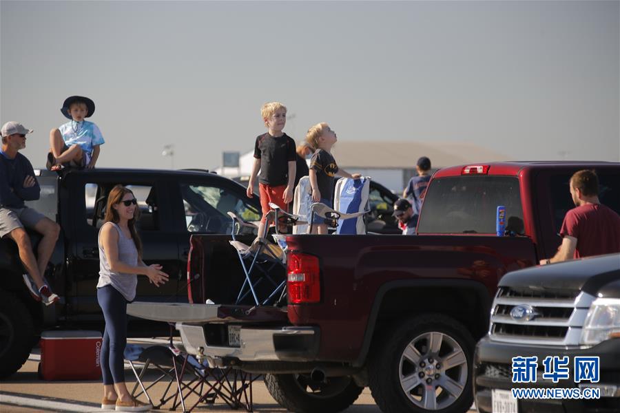 10月10日,在美国休斯敦航空展上,观众在自己的车位观看飞行表演。 一年一度的休斯敦航空展10日至11日在休斯敦埃灵顿机场举行。受新冠疫情影响,主办方除了强调戴口罩和保持距离外,还改变了观看方式。观众驾车进入观看场地,车与车之间需要保持距离,不允许观众随意走动。 新华社发(劳承跃摄)