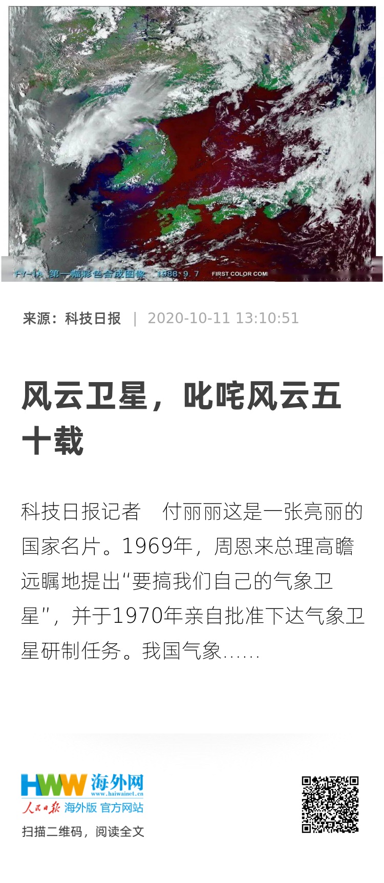 1969年,周恩来总理高瞻远瞩地提出“要搞我们自己的气象卫星”,并于1970年亲自批准下达气象卫星研制任务。我国气象卫星的宏伟蓝图由此铺开。