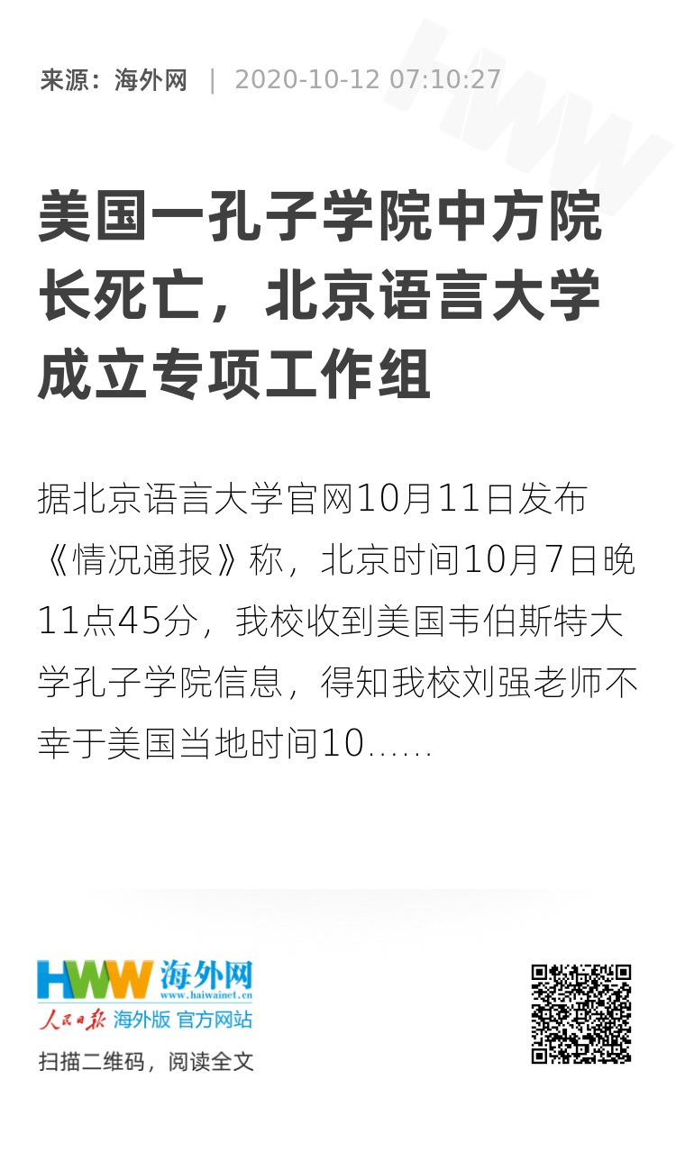 据北京语言大学官网10月11日发布《情况通报》称,北京时间10月7日晚11点45分,我校收到美国韦伯斯特大学孔子学院信息,得知我校刘强老师不幸于美国当地时间10月7日上午去世。听到这个消息,我们感到非常震惊和无比悲痛!
