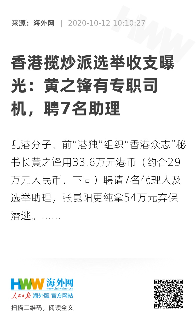 海外网10月12日电 2020年香港立法会选举受疫情影响推迟,不过各参选人仍须申报选举开支。翻看多名揽炒派的选举开支,发现有人出手阔绰以高价聘请家人朋友,例如乱港分子、前“港独”组织“香港众志”秘书长黄之锋用33.6万元港币(约合29万元人民币,下同)聘请7名代理人及选举助理,张崑阳更纯拿54万元弃保潜逃。