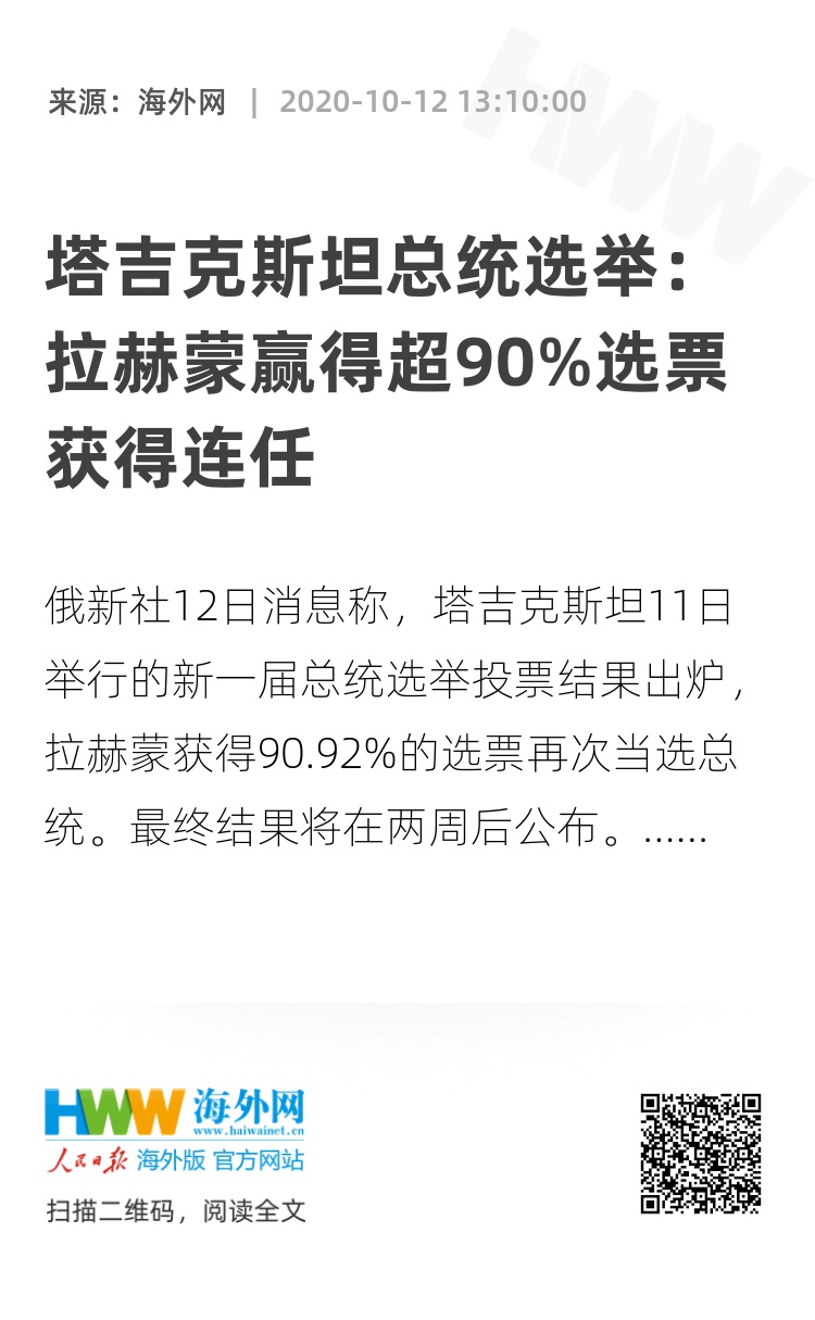 海外网10月12日电 俄新社12日消息称,塔吉克斯坦11日举行的新一届总统选举投票结果出炉,拉赫蒙获得90.92%的选票再次当选总统。最终结果将在两周后公布。
