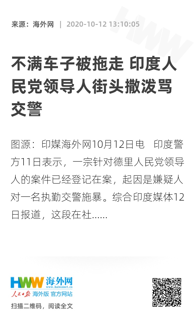 海外网10月12日电 印度警方11日表示,一宗针对德里人民党领导人的案件已经登记在案,起因是嫌疑人对一名执勤交警施暴。