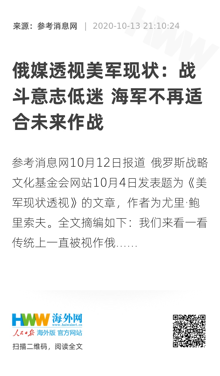 参考消息网10月12日报道 俄罗斯战略文化基金会网站10月4日发表题为《美军现状透视》的文章,作者为尤里·鲍里索夫。全文摘编如下: