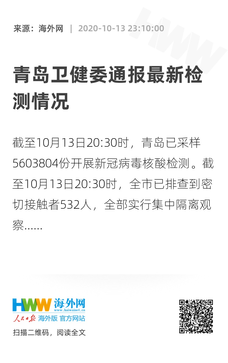 截至10月13日20:30时,青岛已采样5603804份开展新冠病毒核酸检测。