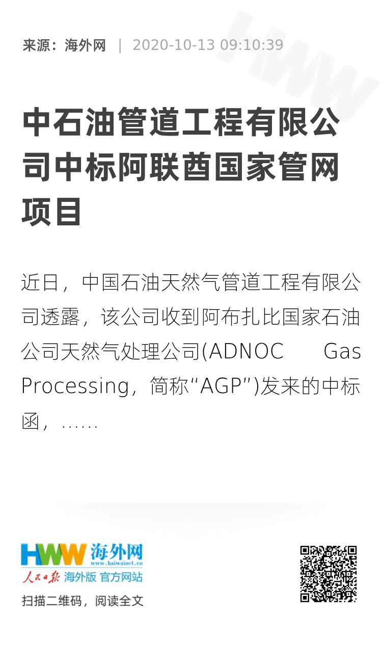 近日,中国石油天然气管道工程有限公司透露,该公司收到阿布扎比国家石油公司天然气处理公司(ADNOC Gas Processing,简称“AGP”)发来的中标函,正式确认由该公司阿布扎比分公司(以下简称“阿分公司”)中标阿联酋国家天然气管网升级FEED(前端工程设计)项目。