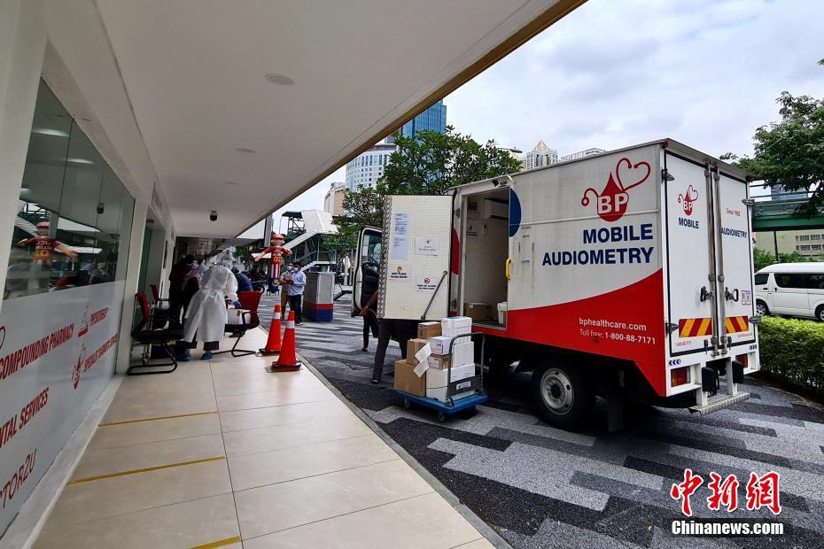 当地时间10月12日,马来西亚吉隆坡一家医院的检测点旁,一辆移动检测车整装待发。当日,马来西亚政府宣布,将在包括首都吉隆坡内的多地实施为期两周的有条件行动限制令。中新社记者 陈悦 摄