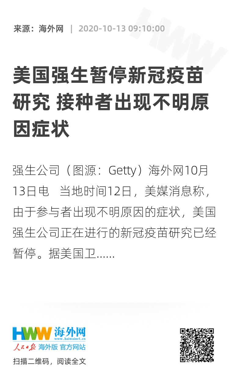 海外网10月13日电 当地时间12日,美媒消息称,由于参与者出现不明原因的症状,美国强生公司正在进行的新冠疫苗研究已经暂停。