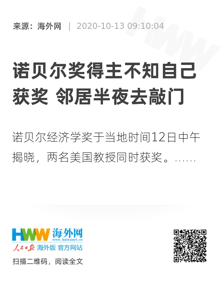 海外网10月13日电 诺贝尔经济学奖于当地时间12日中午揭晓,美国斯坦福大学教授保罗·米尔格罗姆和罗伯特·威尔逊获奖,他们是同事也是邻居。美媒曝光了威尔逊半夜去敲米尔格罗姆的房门,告知他获奖消息的一幕。
