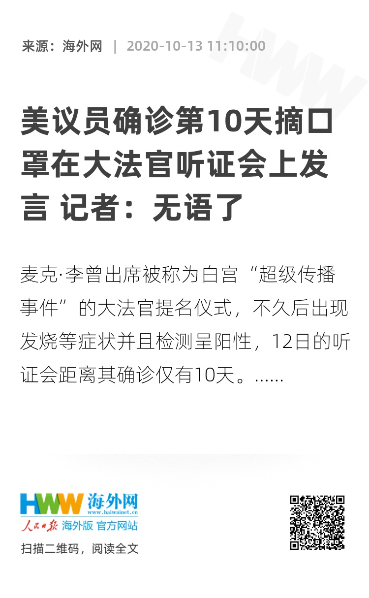 李出席听证会的行为,在社交媒体引发了很多质疑。作家迈克尔·贝斯罗斯斥责称:“为什么麦克·李检测呈阳性后,在听证会发言还能不戴口罩?巴雷特和她全家都在场,所有人都被暴露了。” 华盛顿记者朱莉·洛夫娜也写道:“我对麦克·李已经无语了。”(海外网 赵健行)