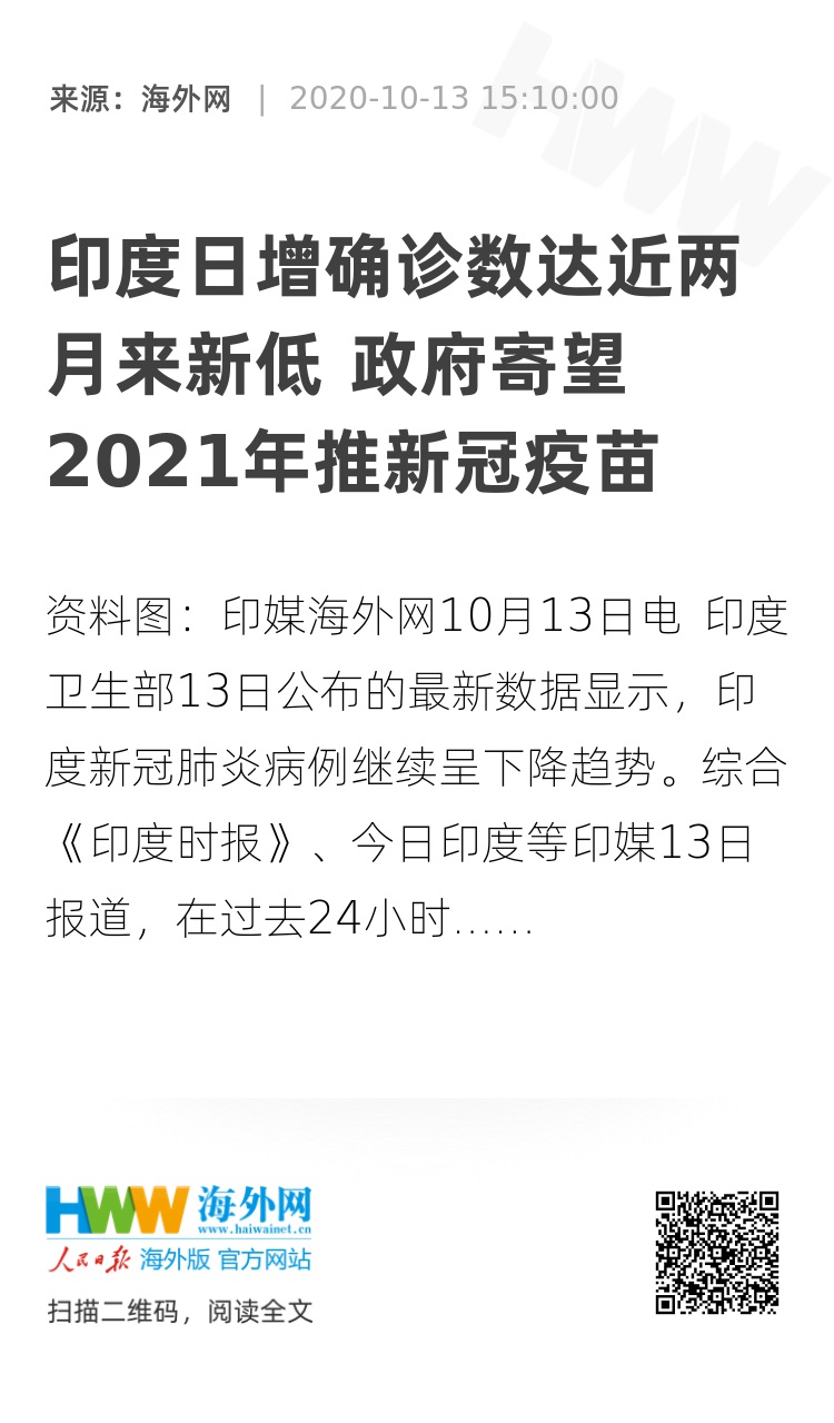 海外网10月13日电 印度卫生部13日公布的最新数据显示,印度新冠肺炎病例继续呈下降趋势。