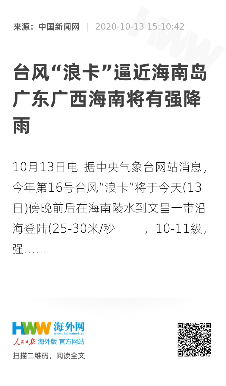 中新网10月13日电 据中央气象台网站消息,今年第16号台风“浪卡”将于今天(13日)傍晚前后在海南陵水到文昌一带沿海登陆(25-30米/秒 ,10-11级,强热带风暴级)。受冷空气和台风“浪卡”的共同影响,13日~15日,华南中西部地区将有中到大雨,其中,广东西南部、广西南部、海南岛的部分地区有暴雨或大暴雨。