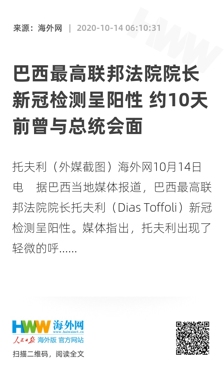 海外网10月14日电 据巴西当地媒体报道,巴西最高联邦法院院长托夫利(Dias Toffoli)新冠检测呈阳性。