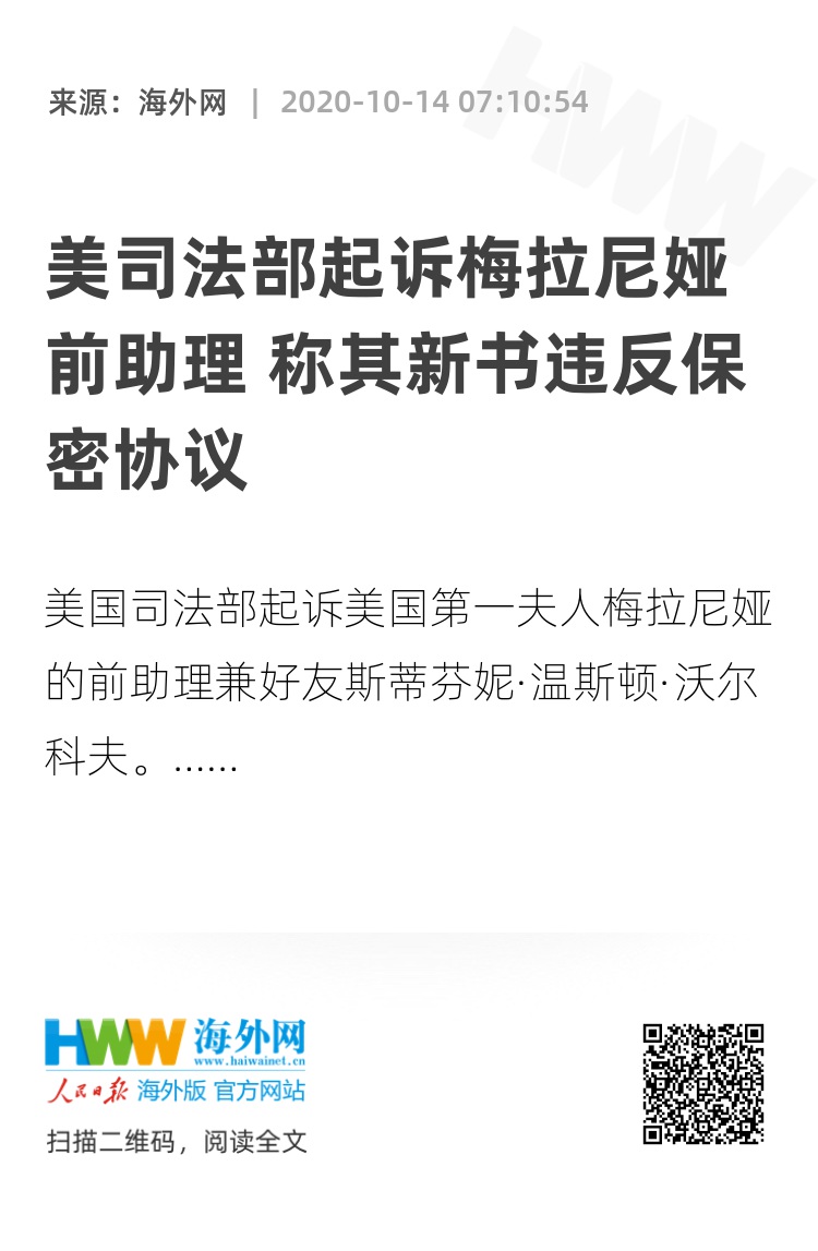 海外网10月14日电 当地时间13日,美国司法部起诉美国第一夫人梅拉尼娅的前助理兼好友斯蒂芬妮·温斯顿·沃尔科夫(Stephanie Winston Wolkoff),因其新书违反了保密协议。
