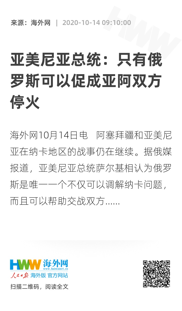海外网10月14日电 阿塞拜疆和亚美尼亚在纳卡地区的战事仍在继续。据俄媒报道,亚美尼亚总统萨尔基相认为俄罗斯是唯一一个不仅可以调解纳卡问题,而且可以帮助交战双方实现停火的国家。