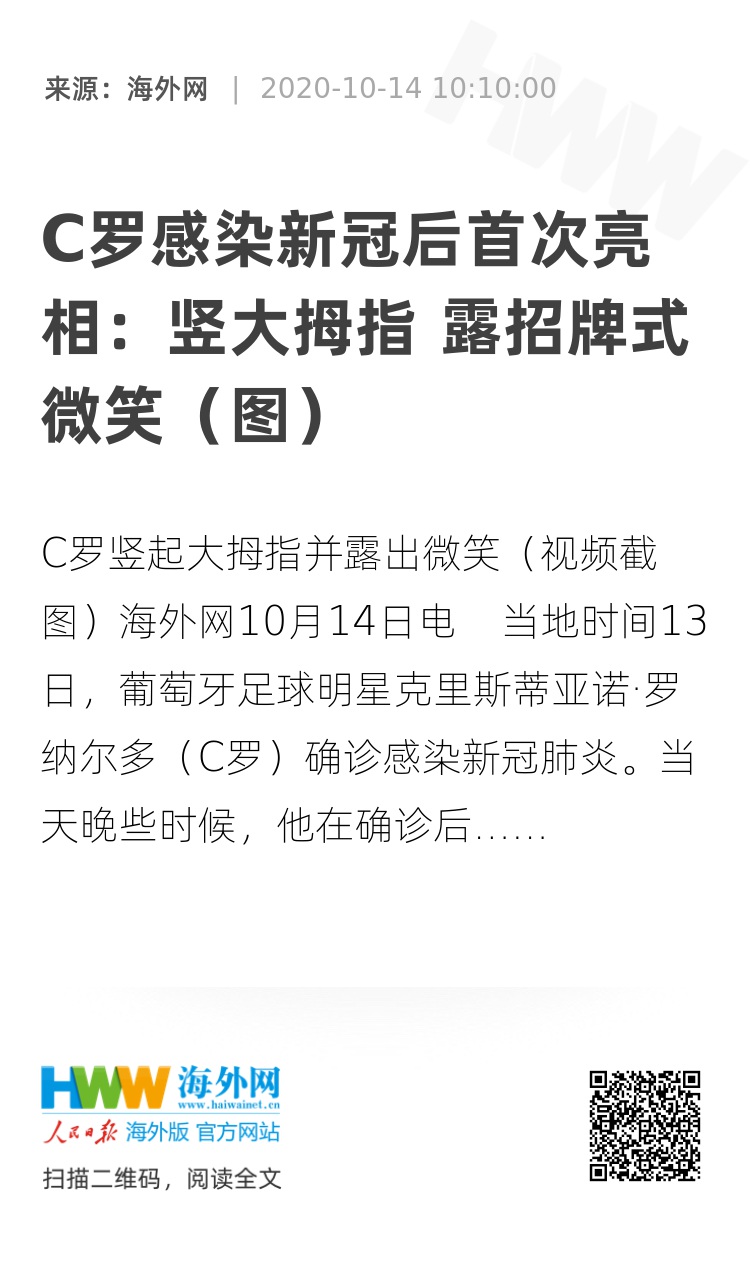 海外网10月14日电 当地时间13日,葡萄牙足球明星克里斯蒂亚诺·罗纳尔多(C罗)确诊感染新冠肺炎。当天晚些时候,他在确诊后首次亮相,出现在隔离酒店的阳台上,发现电视镜头后他竖起大拇指并露出招牌式微笑。