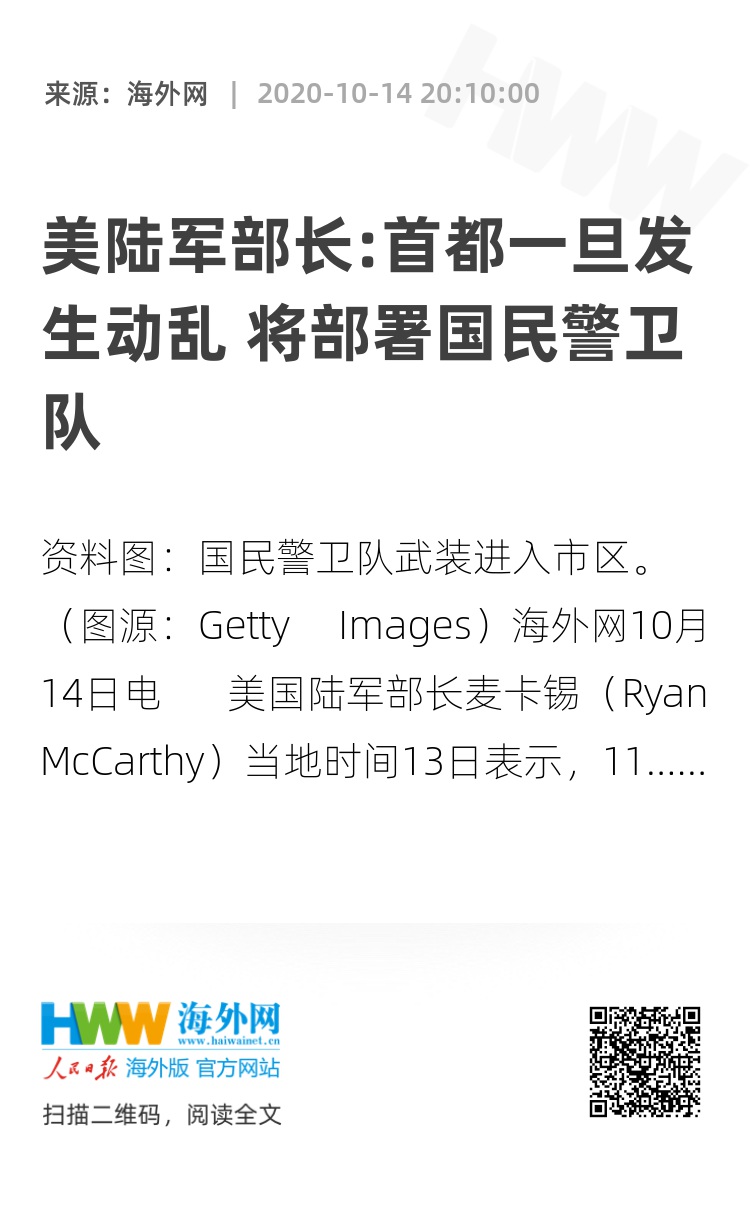 海外网10月14日电 美国陆军部长麦卡锡(Ryan McCarthy)当地时间13日表示,11月万一发生混乱情况,美国国民警卫队(National Guard)后备部队将可部署首都以维持秩序。